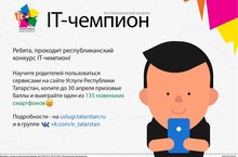 Балалар, «IT-чемпион» республика конкурсы бара. Әти-әниләрегезне Татарстан Республикасы дәүләт хезмәт күрсәтүләре сайты сервислары белән куллана белергә өйрәтегез, 30 нчы апрельга кадәр баллар җыегыз һәм 135 яңа смартфонның берсен бүләккә алыгыз.Тулырак бу турыда uslugi.tatarstan.ru һәм vk.com/e_tatarstan. группаларында белергә мөмкин.