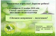 С сегодняшнего дня в нашей школе стартовала акция по сбору макулатуры «Сделаем ненужное – полезным!». Главная цель этого мероприятия – формирование ответственного отношения детей к окружающей природе.