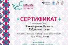 2021 елның 3-7 ноябрендә «Зур этнографик диктант» халыкара акциясе узды. Зур этнографик диктант-Россиядә яшәүче халыкларның мәдәнияте белән таныштыра торган агарту проекты, шулай ук этнокультура грамоталылыгының гомуми дәрәҗәсен бәяләргә мөмкинлек бирә. Анда безнең үзәк методисты Рәхмәтуллин К. Г. катнашты.