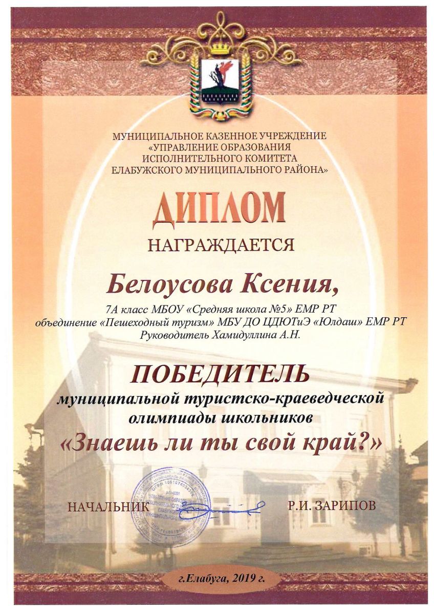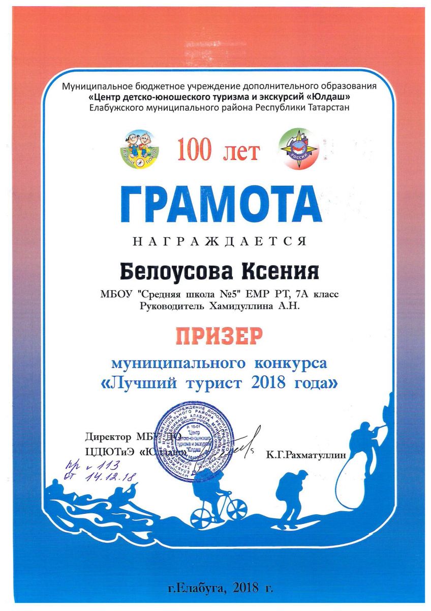 Грамота призера в муниципальном конкурсе "Лучший турист 2018 года" Белоусова Ксения.jpg