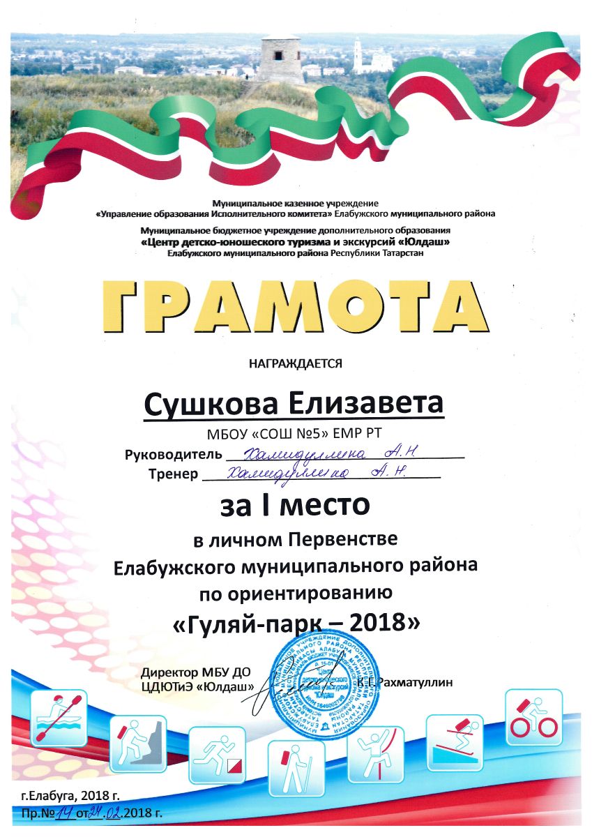 Грамота за 1 место в соревнованиях по спортивному ориентированию туристкого слета учащихся образовательных организаций ЕМР, посвященного Всемирному дню туризмаХадиева Амина.pdf