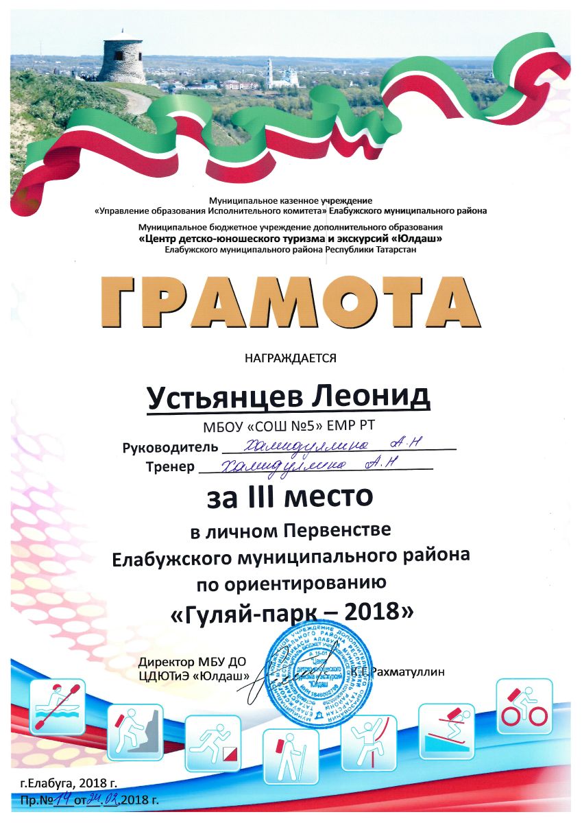 Грамота за 3 место в туристском слёте "Слет туристят" Устьянцев Леонид, 2019 .pdf