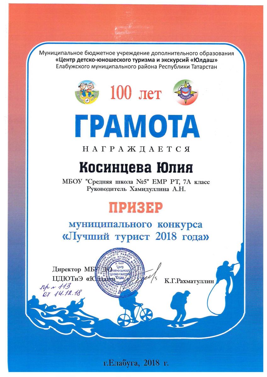 Грамота призера в муниципальном конкурсе "Лучший турист 2018 года" Косинцева Юлия.jpg