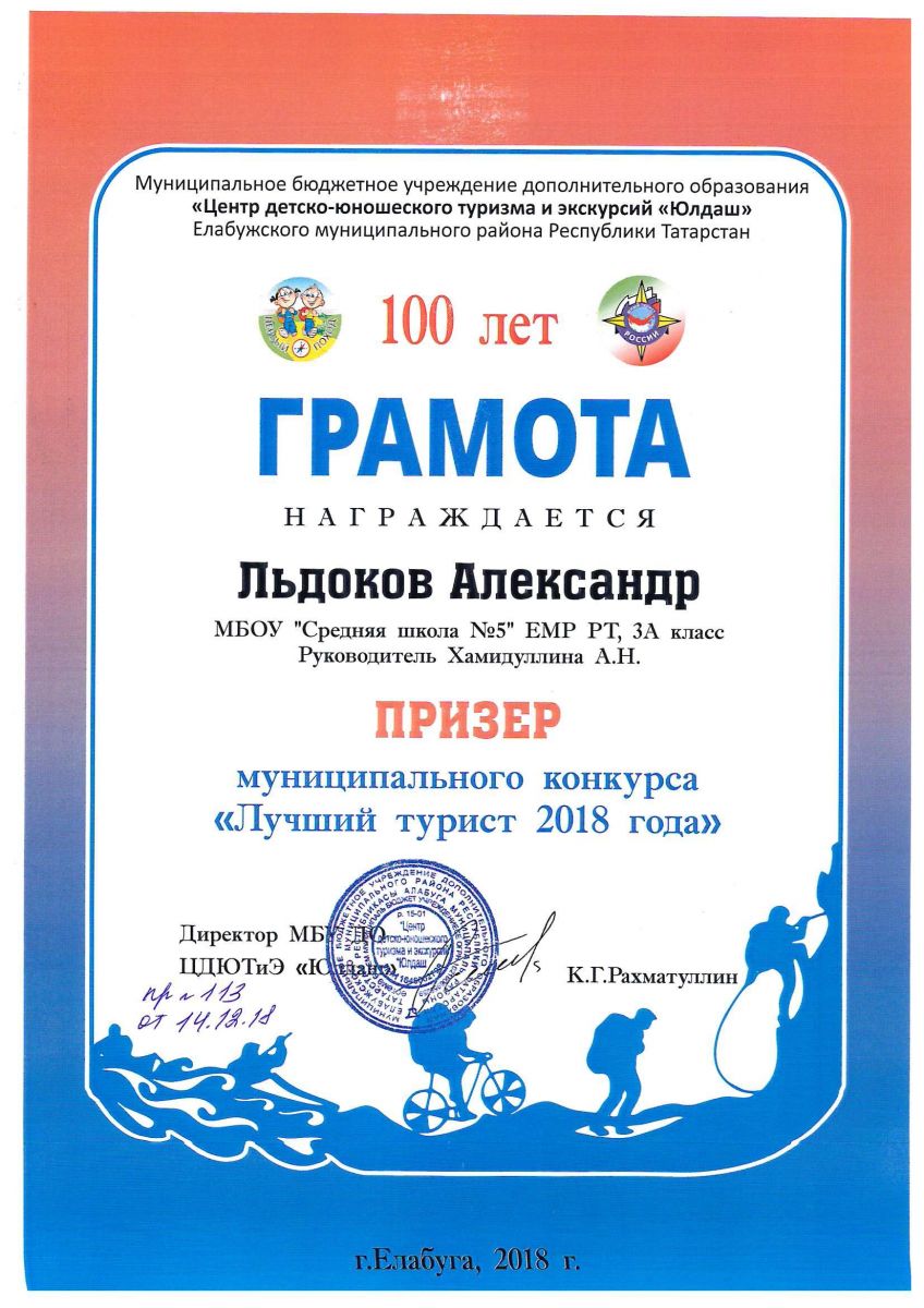 Грамота призера в муниципальном конкурсе "Лучший турист 2018 года" Льдоков Александр.jpg