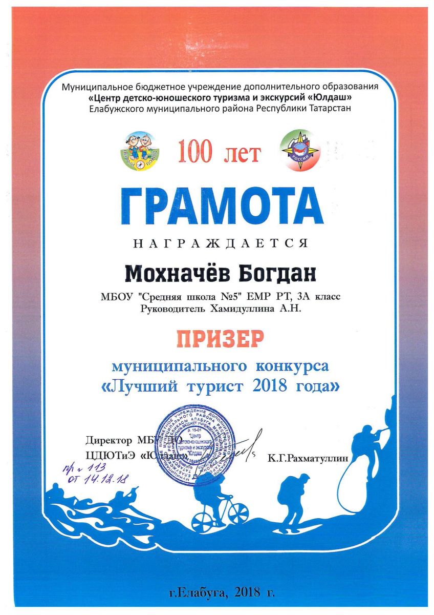 Грамота призера в муниципальном конкурсе "Лучший турист 2018 года" Мохначёв Богдан.jpg