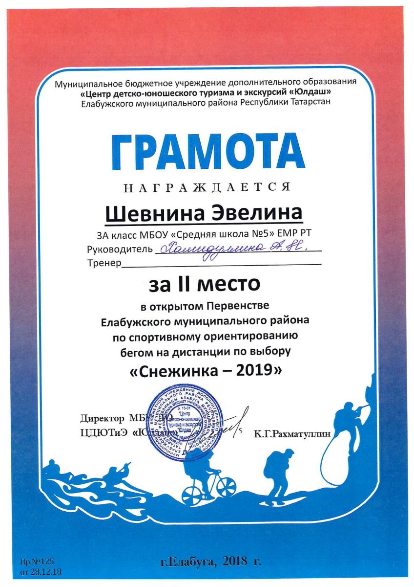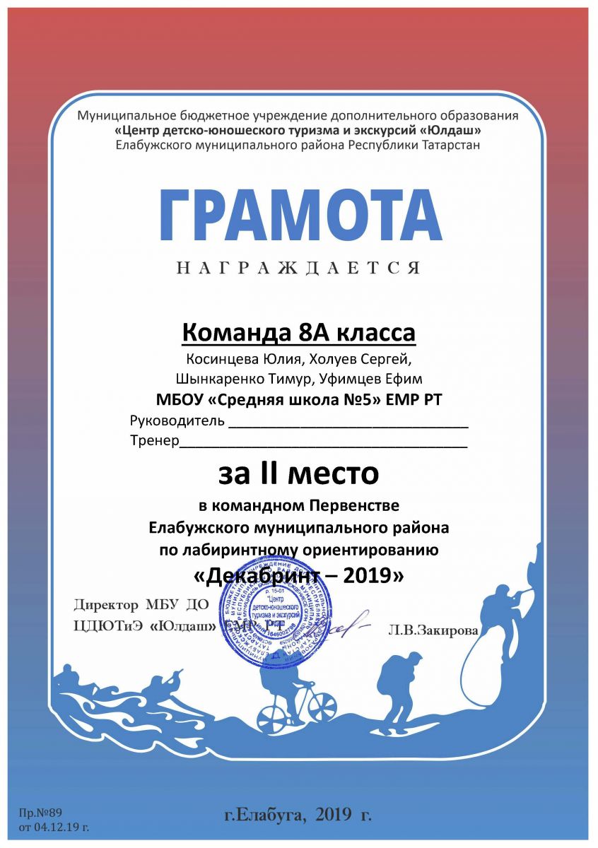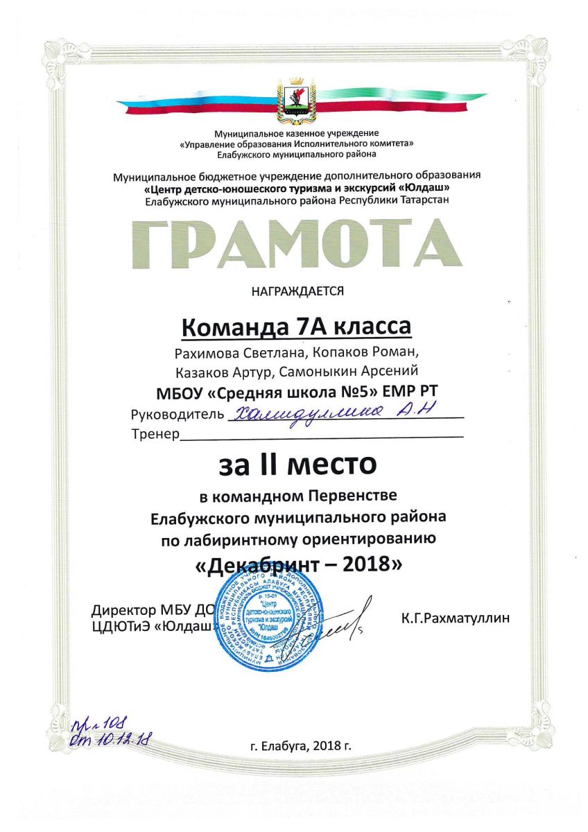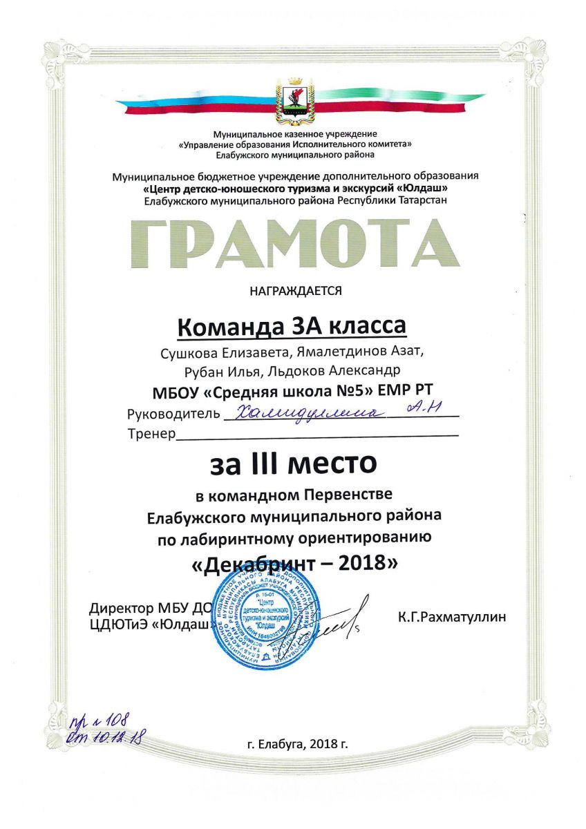 Грамота за 1 место в командном первенстве ЕМР по лабиринтному ориентированию "Декабринт-2018" МБОУ "Средняя школа №5" 3А класс.jpg