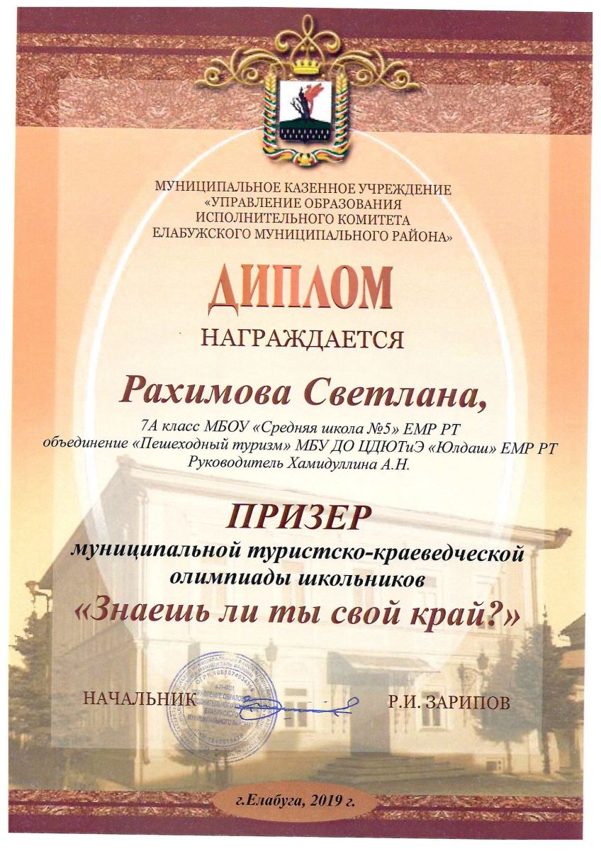 Грамота призера в муниципальном конкурсе "Лучший турист 2018 года" Рахимова Светлана.jpg