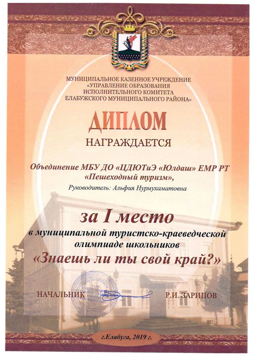 Грамота за 1 место в туристском слёте "Слет туристят" ("Дистанция - пешеходня-группа"),2019.pdf м