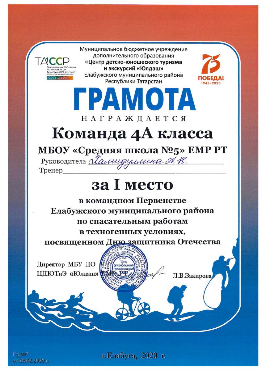 Грамота за 1 место в соревнованиях на туристкой полосе препятствий туристкого слета учащихся образовательных организаций ЕМР, посвященного Всемирному дню туризма 2А 2021 г.