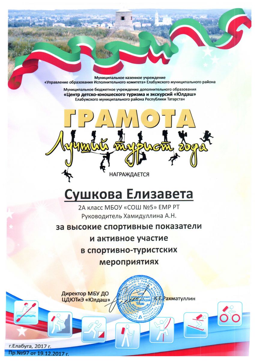 Грамота "Лучший турист 2017 года" Сушкова Елизавета.jpg