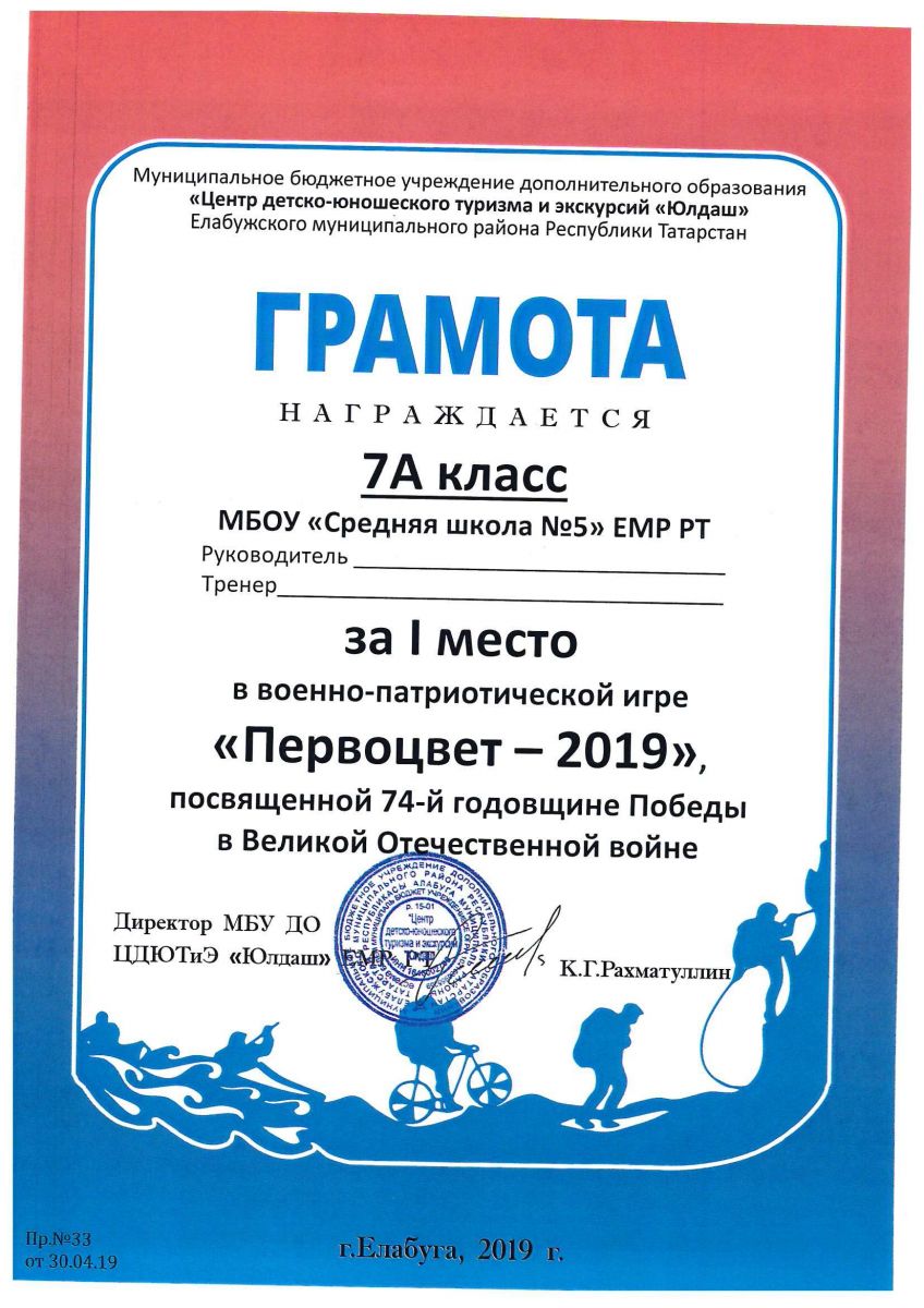 Грамота за 1 место в командном зачете военно-патриотичнческой игре "Первоцвет-2019".jpg