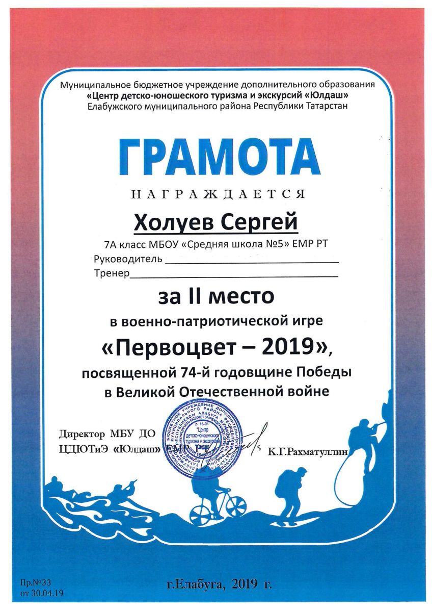 Грамота за 2 место в военно-патриотической игре "Первоцвет-2019" Холуев Сергей.jpg