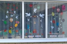 Учащиеся совместно с классными руководителями украшали окна школы тематическими вырезанными изображениями и символами Победы. Каждый элемент наполнен глубоким смыслом. На окнах появились изображения цветов
