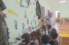 В средней Б группе организован мини музей на патриотическую тему, и ребята старшей Б группы посетили этот музей, где имеются военные головные уборы, плащ-палатка и т.д. Спасибо воспитателю Фирание Вагизовне за организацию мини-музея, с такими интересными военными экспонатами!