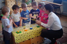 Молодой воспитатель Виктория Касимова проводит эксперименты с водой во 2 младшей А группе. Детишки проверяют воду на вкус, цвет, запах с добавлением разных продуктов.