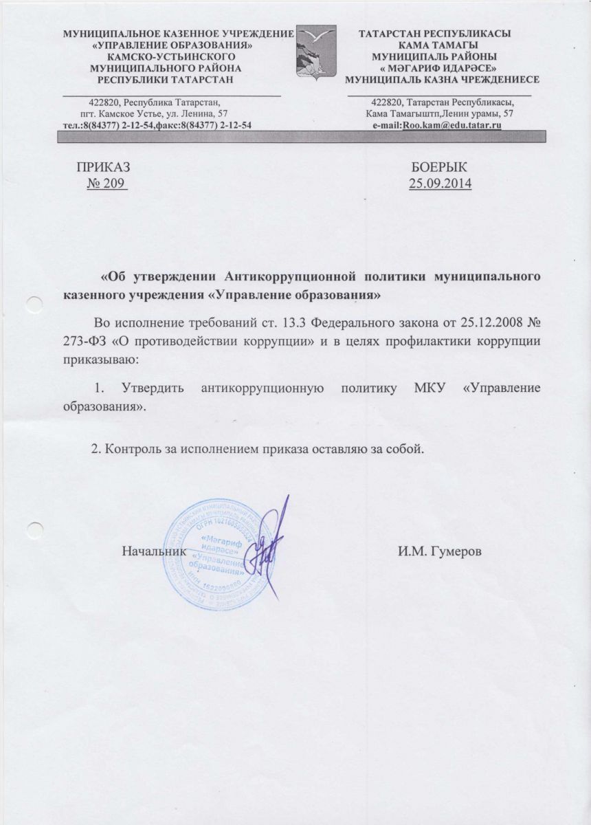 Приказ об утверждении Антикоррупционной политики МКУ "Управления образования"