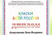 В VI Всероссийском конкурсе рисунков, живописи и прикладного творчества школьников с ограниченными возможностями здоровья «Краски всей России» приняли участие обучающиеся объединений дополнительного образования «Юный Художник» (педагог Сабитова Р.Р.) и «Прикладное творчество» (педагог Сороковнина Г.А.). Ахметзянова Зиля и Валиева Зарина. ученицы МБОУ «Камско-Устьинская татарская СОШ» и педагоги дополнительного образования Центра внешкольной работы награждены дипломами.