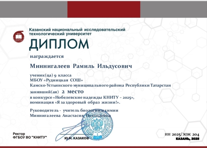 Миннигалеев Рамиль - 2 место в Республиканском конкурсе "Нобелевские надежды КНИТУ - 2025"