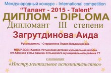Загрутдинова Аида ученица Камско-Устьинской детской музыкальной школы стала дипломантом III степени в Международном конкурсе ТАЛАНТ-2015.