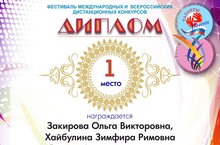 Дипломом III степени награждена преподаватель Закирова Ольга Викторовна во Всероссийском дистанционном конкурсе работников образования "Лучшая методическая разработка"
