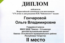 Гончарова Ольга ученица Камско - Устьинской детской музыкальной школы награждена дипломом за II место во Всероссийской олимпиаде "175 - летие со дня рождения П.И.Чайковского"