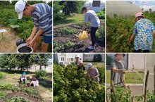 Продолжается летняя трудовая практика на школьном огороде. Обучающиеся поливают цветы, собирают смородину, пропалывают грядки с овощами./ Мәктәп бакчасында җәйге эшләр дәвам итә. Укучылар карлыган җыялар, чәчәкләргә, яшелчәләргә су сибәләр, чүп утыйлар.