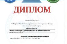 Диплом победителя I степени в VI Всероссийской научно-практической конференции "Татары, прославившие свой народ" завоевала Вафина А. Преподаватель: Саттарова А.М. Поздравляем! Желаем дальнейших успехов!