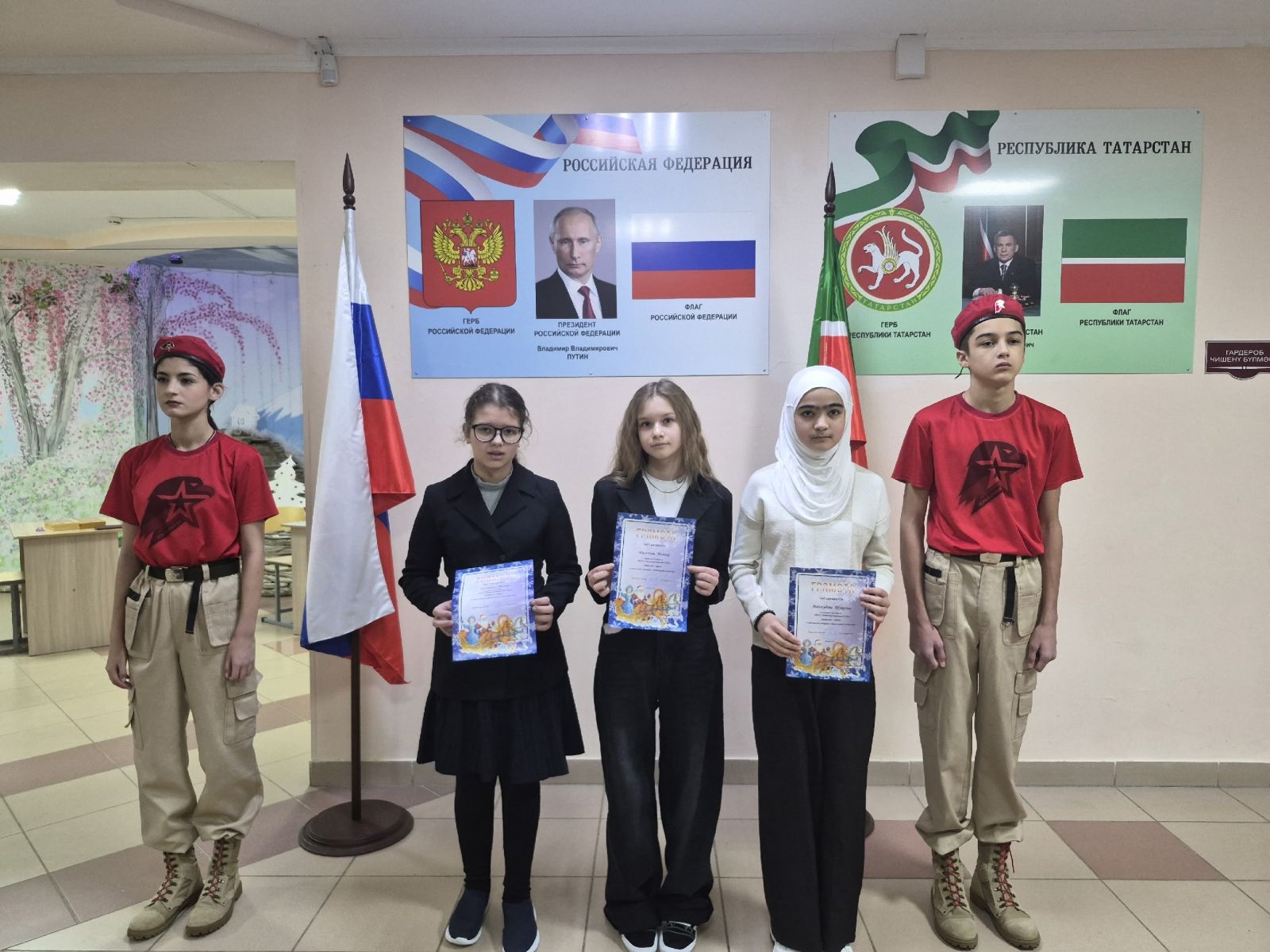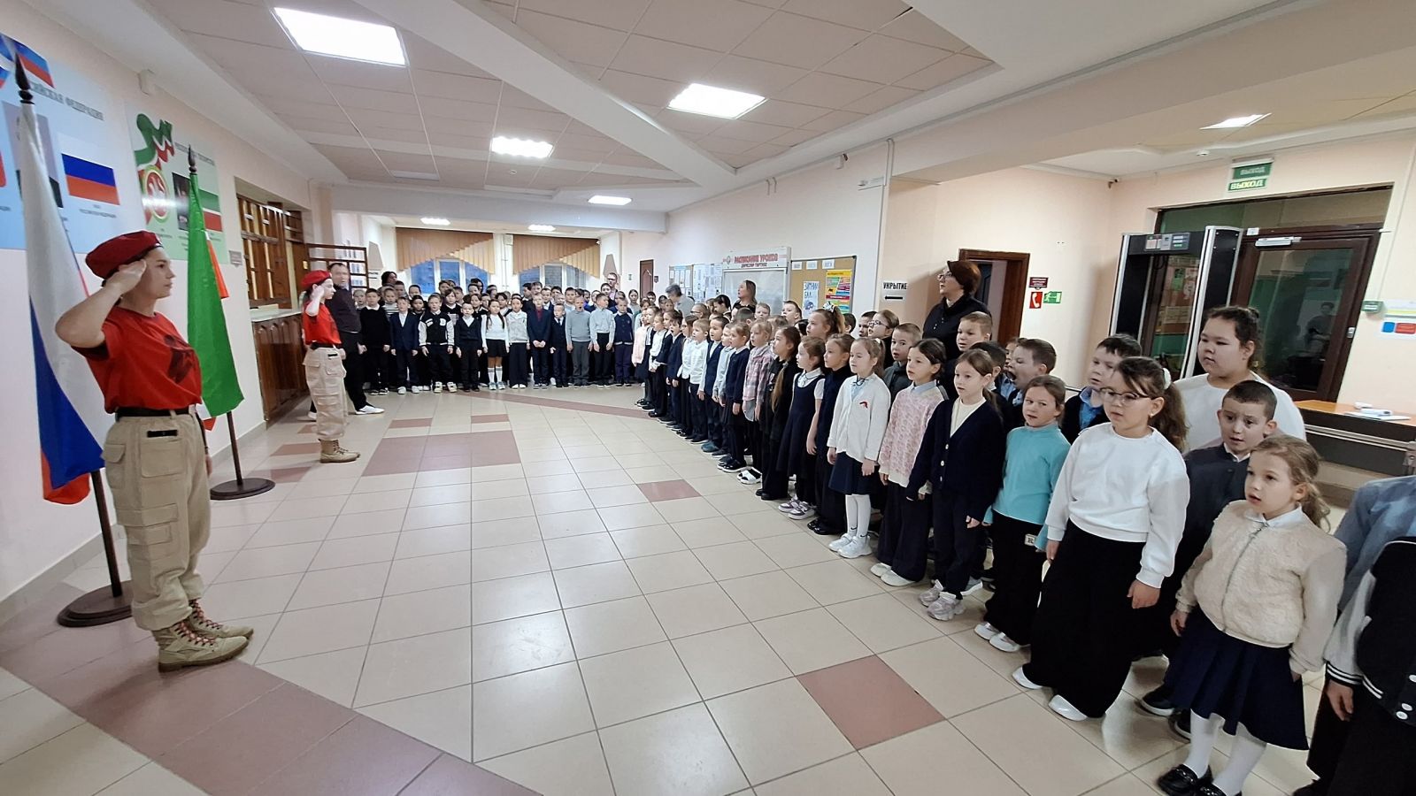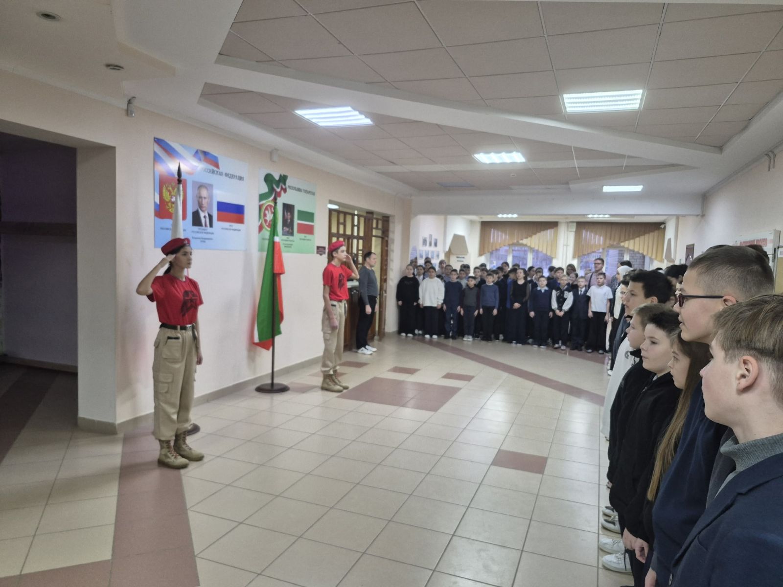 12 гыйнварда РФ һәм ТР гимннары башкарылган атналык линейка үтте. Анда 1-4 сыйныф укучылары катнашты. Яшь армиячеләр Солтанова Ралина һәм Шәмсиева Мөнирәгә Россия Федерациясе һәм Татарстан Республикасы дәүләт флагларын күтәрү хокукы бирелде. Киләчәк уку атнасында илебез билгеләп үтәчәк дәүләт әһәмиятле даталары һәм вакыйгалары белән танышу булды. Мәктәп һәм район конкурсларында һәм акцияләрендә катнашучыларга грамоталар һәм дипломнар тапшырылды.