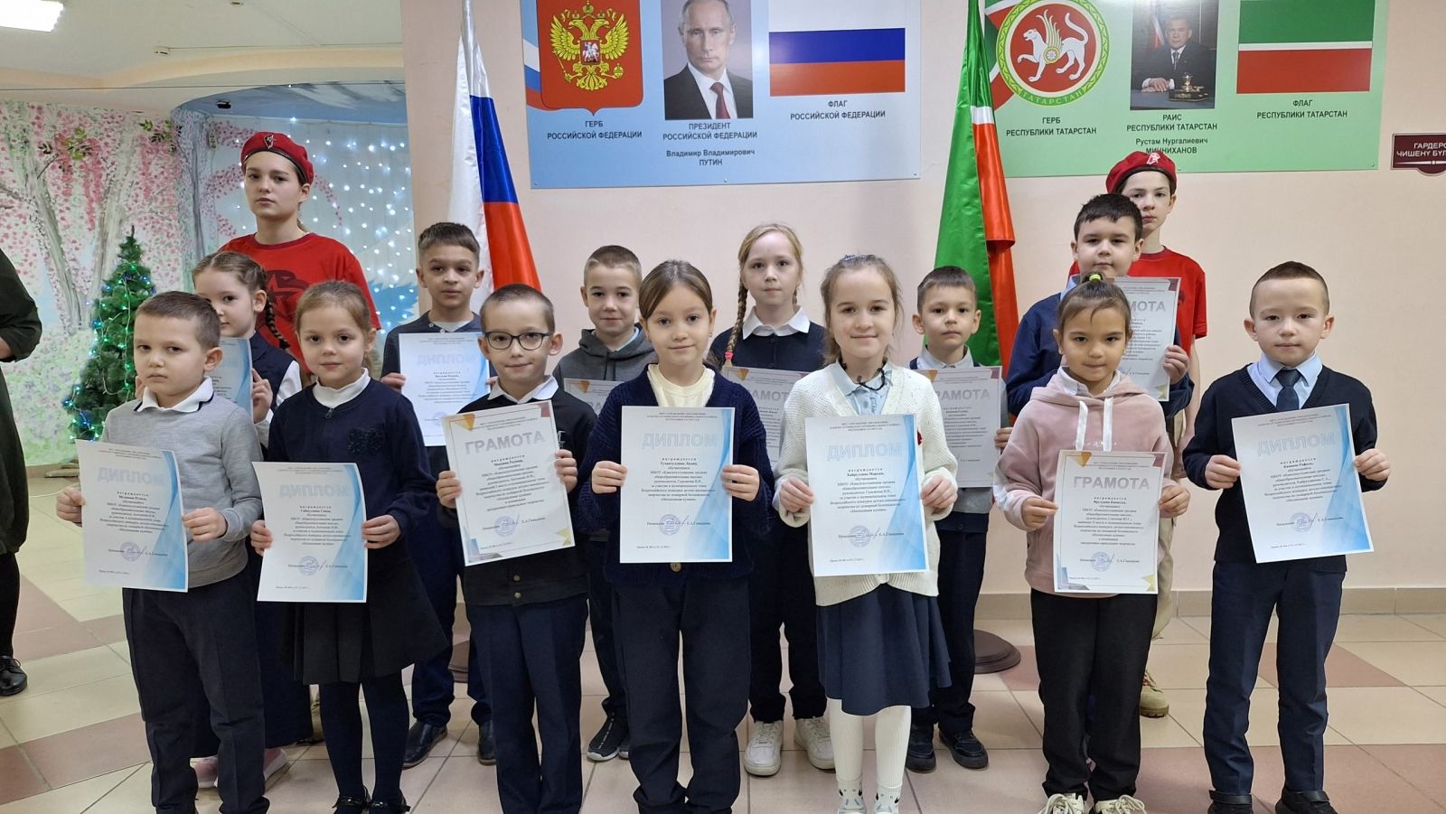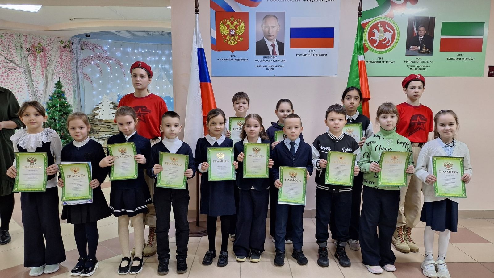12 января прошла еженедельная линейка с исполнением гимнов РФ и РТ. Участниками стали обучающиеся 1-4 классов. Почетное право поднять государственные флаги Российской Федерации и Республики Татарстан предоставили юнармейцам Султановой Ралине и Шамсиевой Мунире. Прошло ознакомление с государственными значимыми датами и событиями, которые наша страна будет отмечать на предстоящей учебной неделе. Были вручены грамоты и дипломы участникам школьных и районных конкурсов и акций.