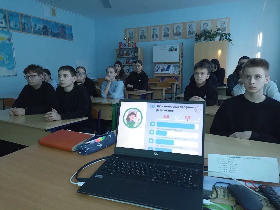 На занятии обучающиеся узнали об особенностях, алгоритме и сроках прохождения профориентационных диагностик на портале «Билет в будущее». Обучающимся предложили пройти диагностики: «Мои интересы» и «Мой профиль». Просмотр и обсуждение видеороликов, работа с материалами занятия под руководством педагогов, самостоятельная работа помогли ребятам понять, что профессиональные интересы играют большую роль в выборе профессиональной деятельности, профильности общего обучения, дополнительного образования.