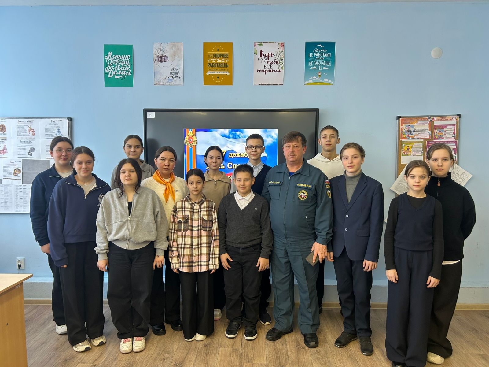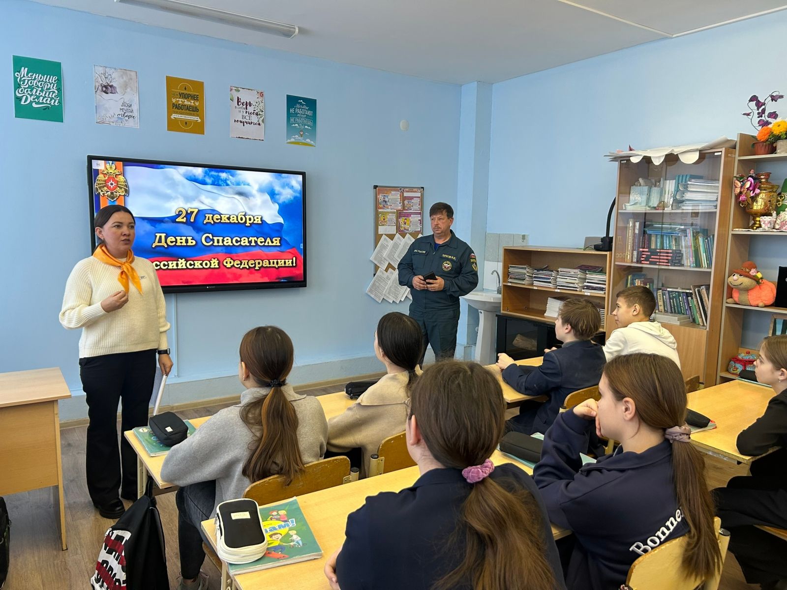 Спасатель – одна из самых нужных и важных профессий. В руках тех, кто несет службу в подразделениях МЧС России, – безопасность людей, их спокойствие и уверенность в своем будущем. В подразделениях МЧС России трудятся настоящие профессионалы – люди, для которых обычной и повседневной работой является постоянный риск, которые ежедневно предотвращают тяжкие последствия катастроф, разгула стихии или просто идут на выручку тем, кто попал в сложную ситуацию. Отвага и мужество, готовность к самопожертвованию во имя спасения жизни людей всегда отличали представителей этой профессии. Советник директора по воспитанию Гимадиева Г.К. пригласила начальника караула 116 ПСЧ 8 ПСО ФПС ГПС ГУ МЧС России по РТ Тарасова Фёдора Юрьевича, который рассказал ребятам нашей школы о своей профессии и правилах безопасности на зимних каникулах.