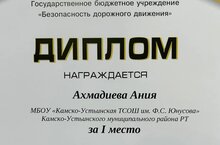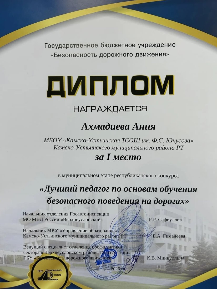 Поздравляем Ахмадиеву А. З. с призовым местом в муниципальном этапе республиканского конкурса "Лучший педагог по основам обучения безопасного поведения на дорогах".