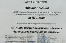 Поздравляем Айсину А. Ш. с призовым местом в муниципальном этапе республиканского конкурса "Лучший педагог по основам обучения безопасного поведения на дорогах".