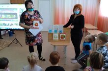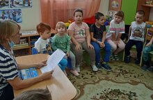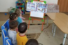 Воспитатель в старшей разновозрастной группе и библиотекарь местной библиотеки просмотрели сказку с воспитанниками " У страха глаза велики"