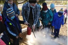Командир отряда ДЮП Миннизянов Т. показал ребятам, как правильно пользоваться огнетушителем. -