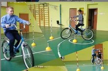 Внеурочная деятельность "Безопасное колесо" проходит в спортивном зале, ребята учатся проходить сложные маневры по станциям.