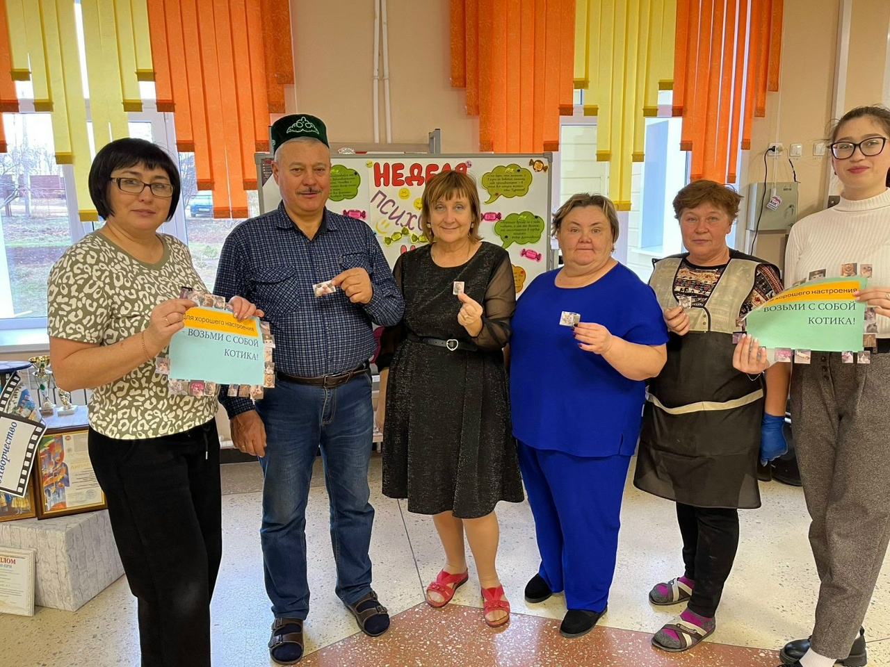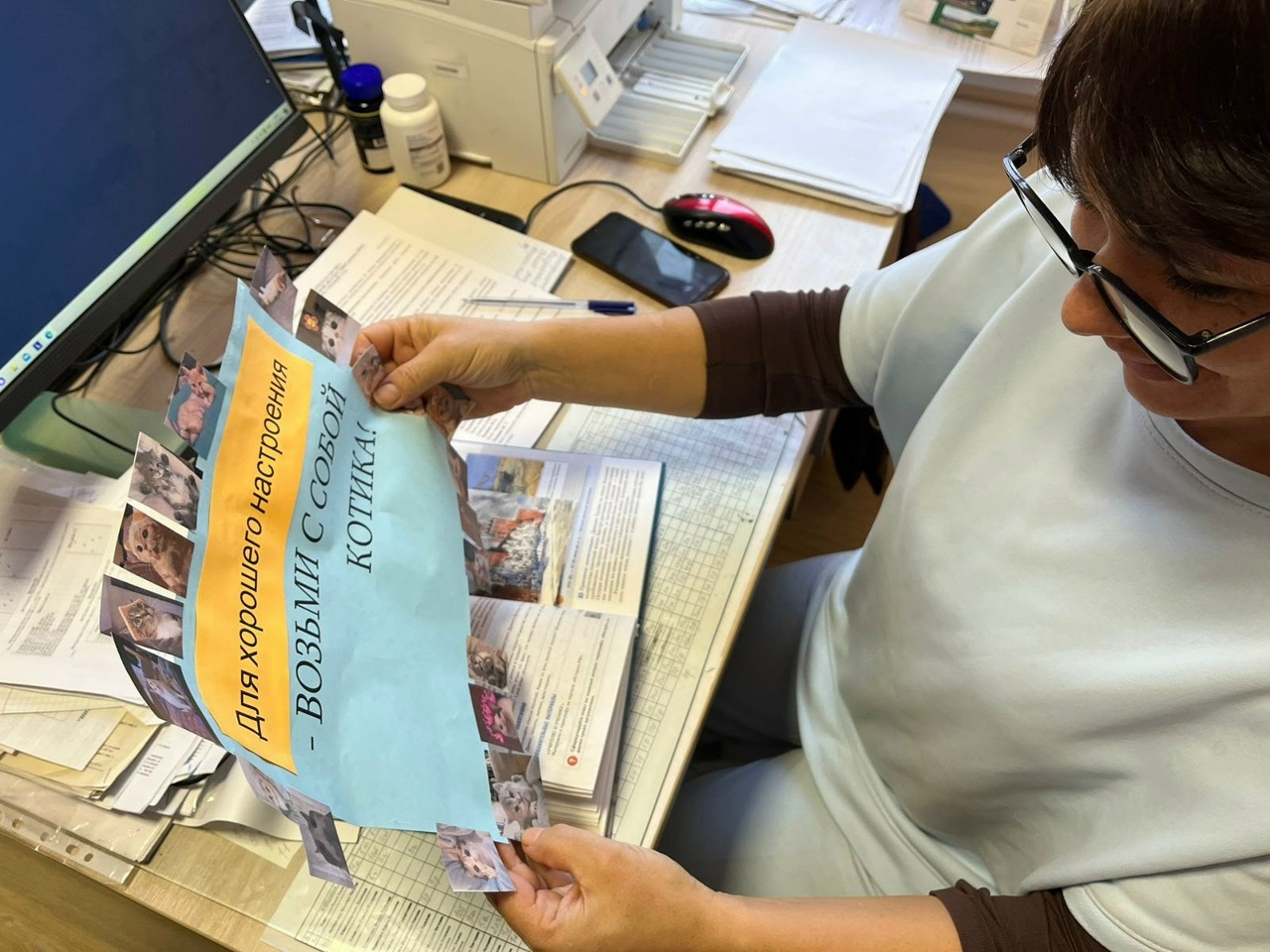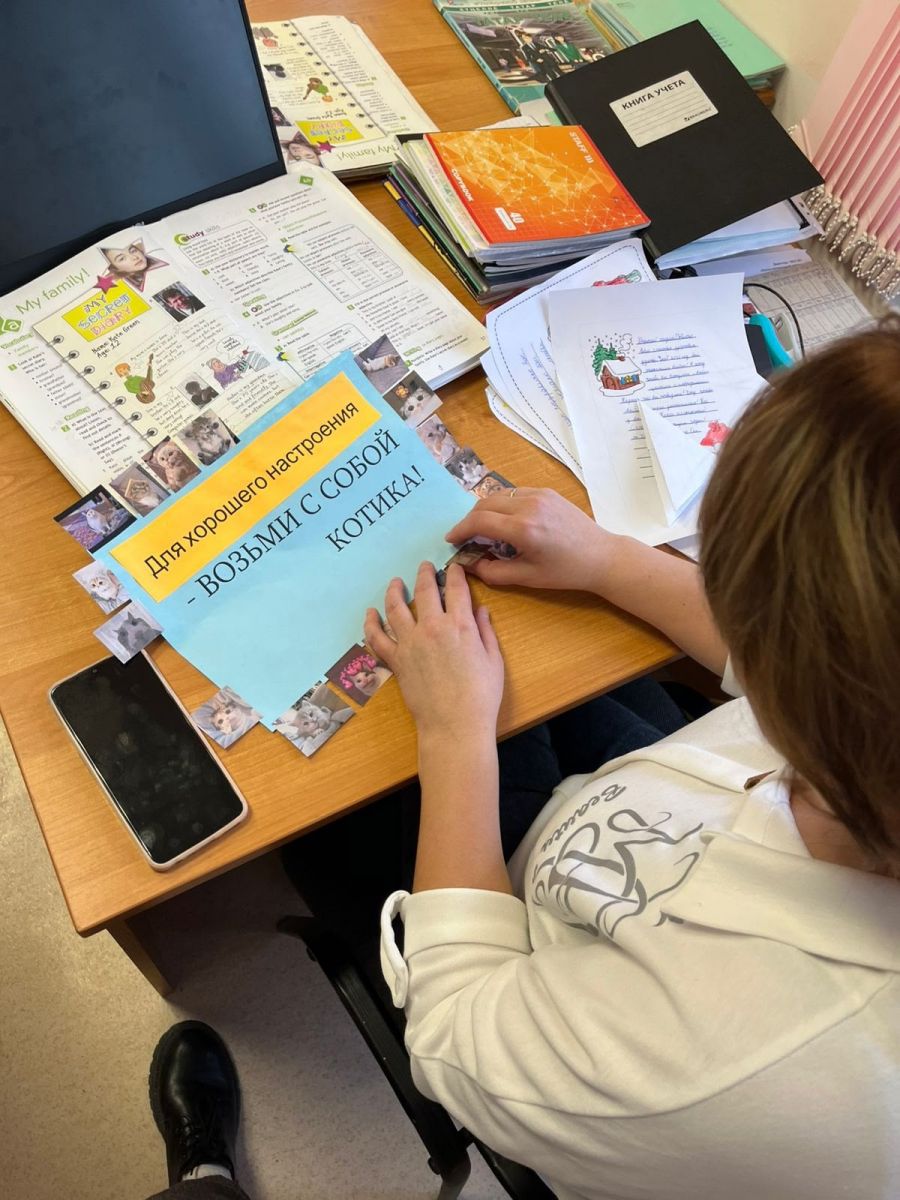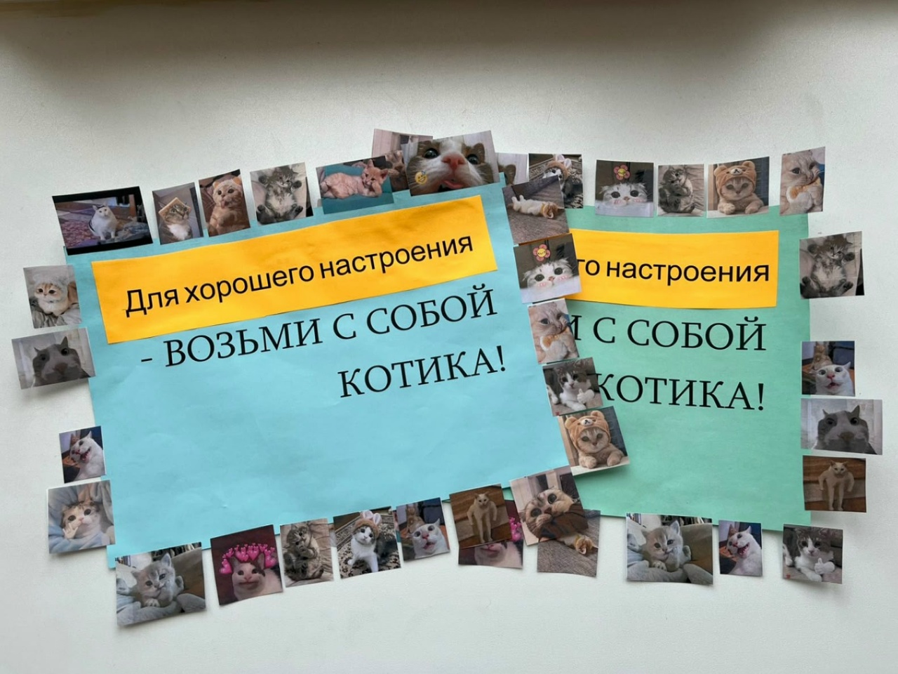 Педагог организатор вместе с советником приготовила листы с наклейками котиков, где было в центре листа написано: "Хорошее настроение- Возьми с собой котика». И тогда на процентов человек становился счастливее.