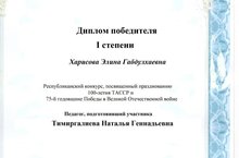Дипломом 1 степени в Республиканском конкурсе, посвящённым празднованию 100-летия ТАССР и 75-годовщине Победы в Великой Отечественной войне награждена ученица 9 класса Харисова Э.(рук. Тимиргалиева Н.Г.). Поздравляем победителя и руководителя с победой. Удачи в учёбе!