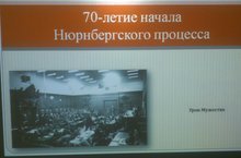 15 января был проведен урок Памяти, посвященный 70-летию Международного военного трибунала в Нюрнберге, для учащиеся 5-11 классов. Цель данного мероприятия рассказать учащимся об истории проведения Международного военного трибунала над главными военными преступниками Германии, познакомить подрастающее поколение с еще одной страницей истории Второй мировой войны. Показать, что главный урок Нюрнбергского процесса заключается в напоминании ныне живущим поколениям о страшной трагедии, грозившей всему миру, о подвиге наших соотечественников и других объединенных наций, о значимости решений состоявшихся судов для миллионов судеб человечества. Обвинительные приговоры на этом процессе подтвердили, что террор и агрессия, направленные против мирного населения, никогда не остаются безнаказанными.