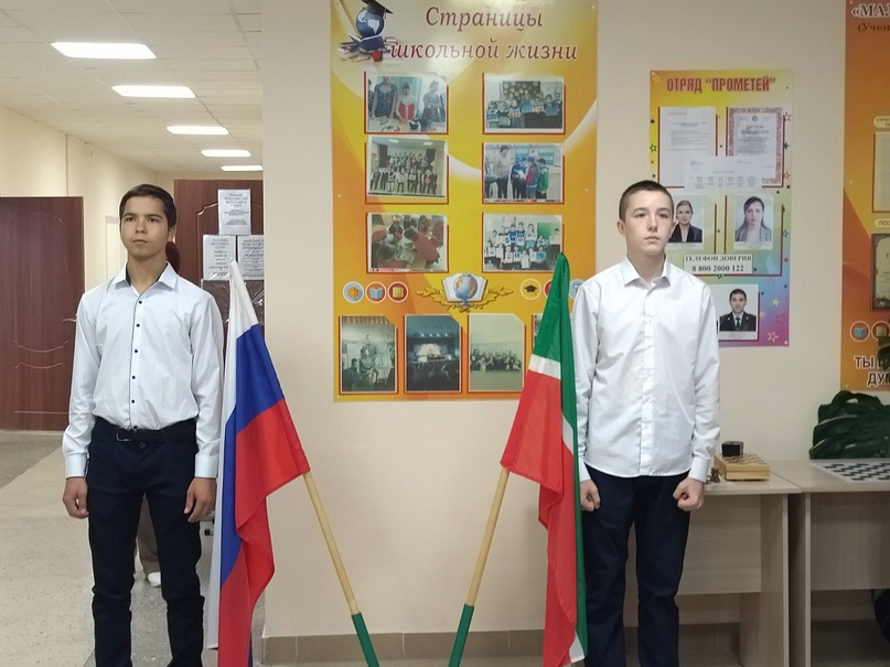23 октября 2023 года по традиции день начался с выноса государственных флагов и исполнения гимнов. Право вынести государственный флаг Российской Федерации и флаг Республики Татарстан предоставлено участникам школьной баскетбольной лиги "КЭС-БАСКЕТ" Сафину И. и Бикмухаметову Р., учащимся 10 класса.