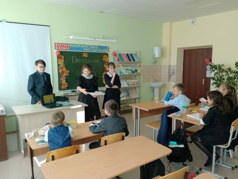 Сегодня, 20 сентября, во 2 классе учащиеся 7 класса провели мероприятие "Отпечаток осени". Дети отгадывали загадки, читали стихи про осень, говорили приметах и дарах осени. Усманов Э. помог им передать в своих рисунках отпечаток осени.
