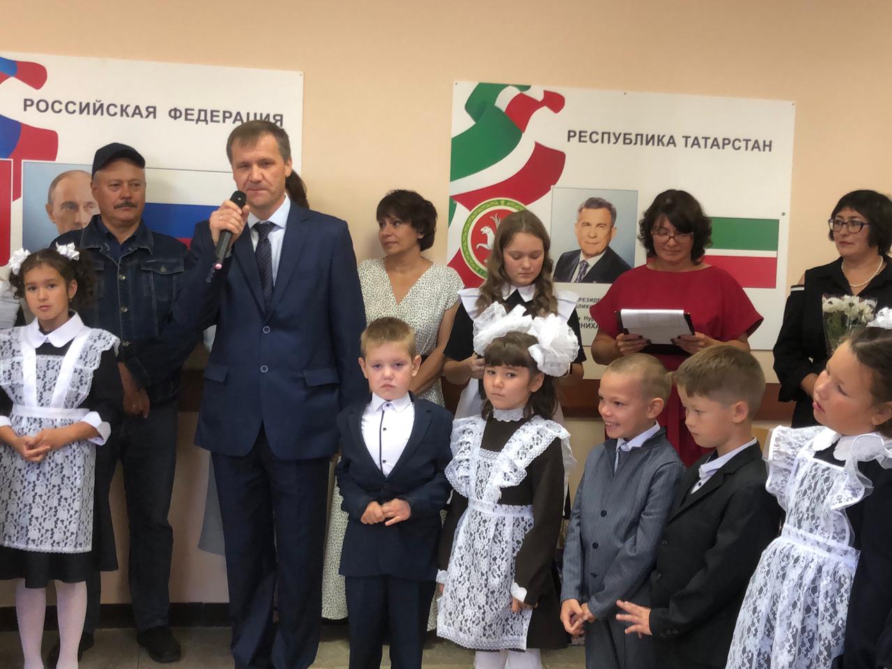 Почётное право поднять флаг Российской Федерации и флаг Республики Татарстан на этой неделе было предоставлено награжденным нагрудным знаком «За заслуги в образовании» учителю русского языка и литературы Валеевой В. И. и учителю родного (татарского) языка Хусаиновой В. Р.