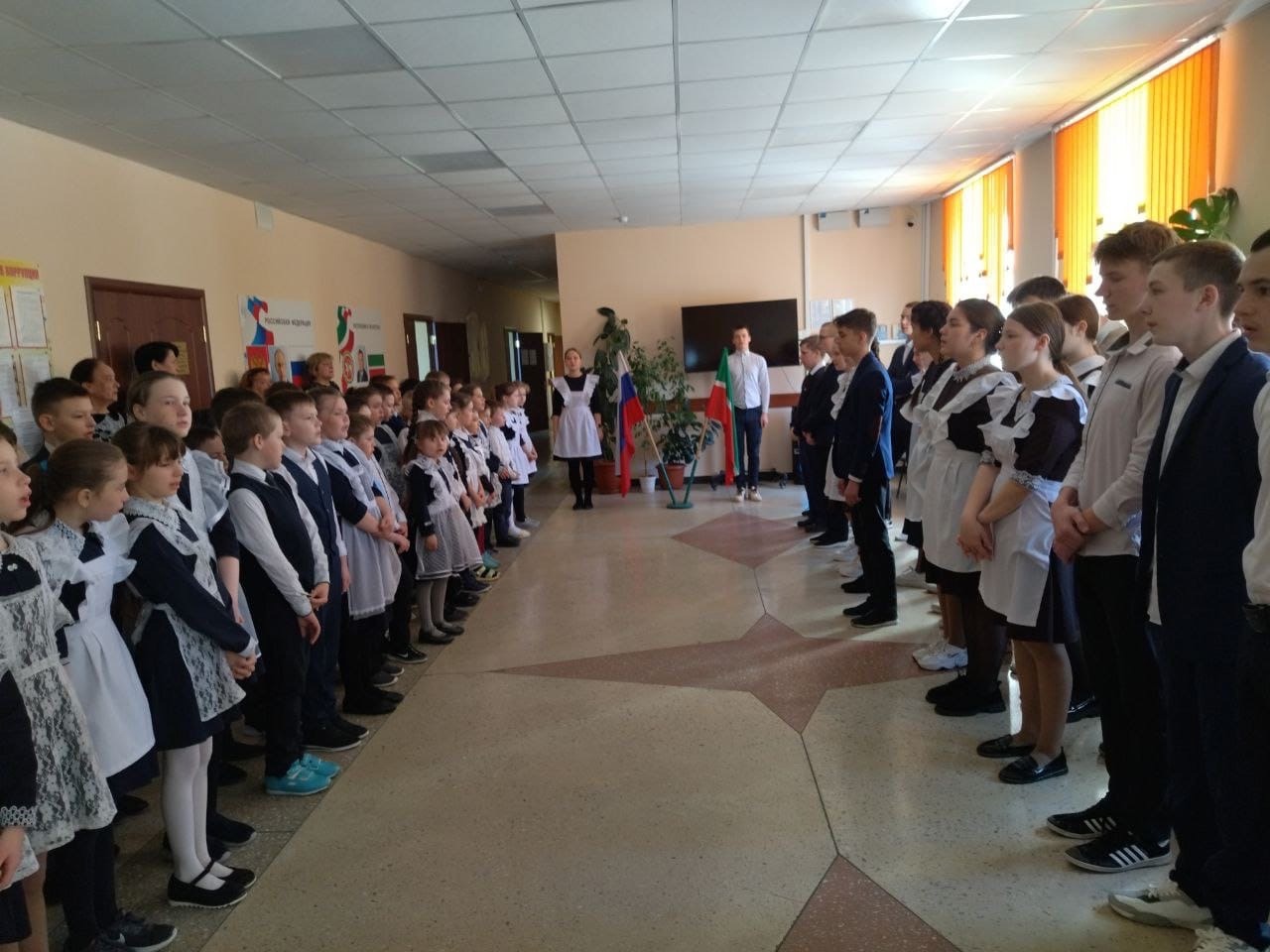 #МБОУРудницкаяСОШ 10 апреля. Новая учебная неделя началась с традиционной общешкольной линейки с выносом флагов и исполнения гимнов. Почетное право вынести флаг Российской Федерации и флаг Республики Татарстан на этой неделе было предоставлено Ахметзяновой Алии-победителю республиканского этапа конкурса "Замечательный вожатый" в номинации «Самый креативный» и победителю соревнований по бадминтону - Зиновьеву Роману.