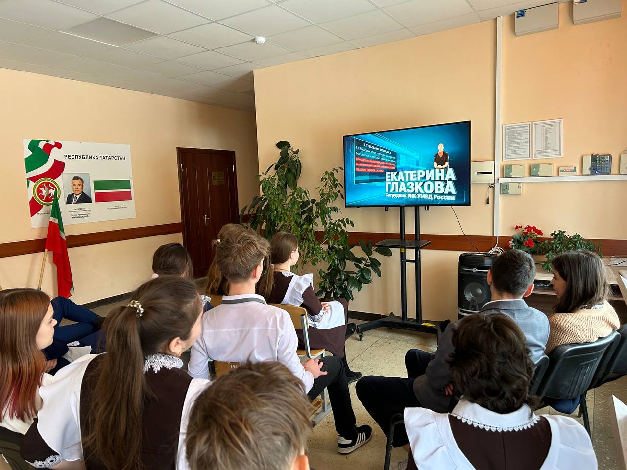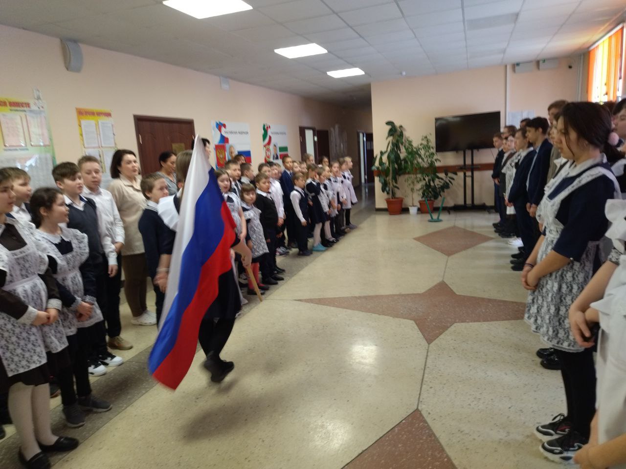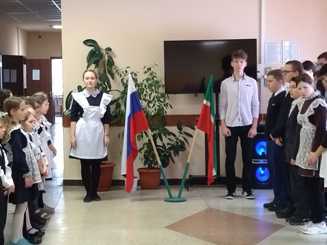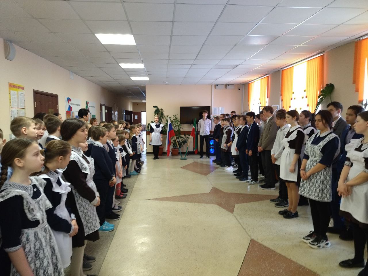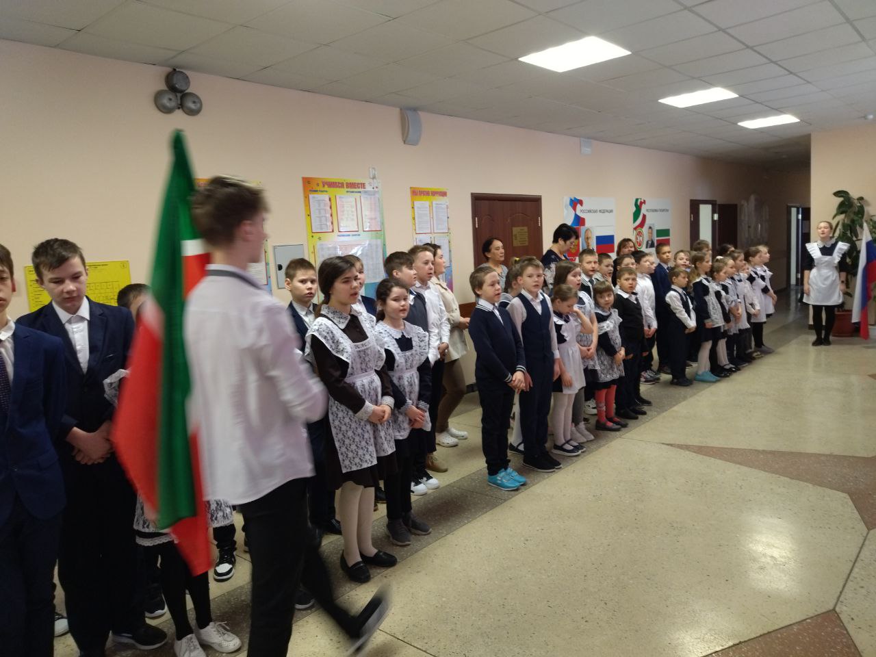 Новая учебная неделя в школе началась с выноса флагов и исполнения гимнов. Почетное право вынести флаг Российской Федерации и флаг Республики Татарстан на этой неделе было предоставлено победителю зонального этапа конкурса "Замечательный вожатый" , обладателю Гран -при театрального конкурса "Магия театра" -Ахметзяновой Алии и активному участнику конкурса "Секреты дружного класса" - Колесникову Никите.