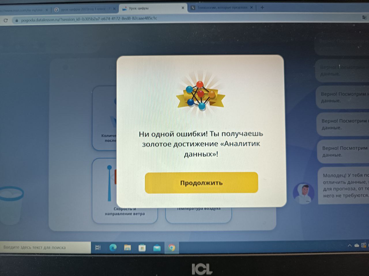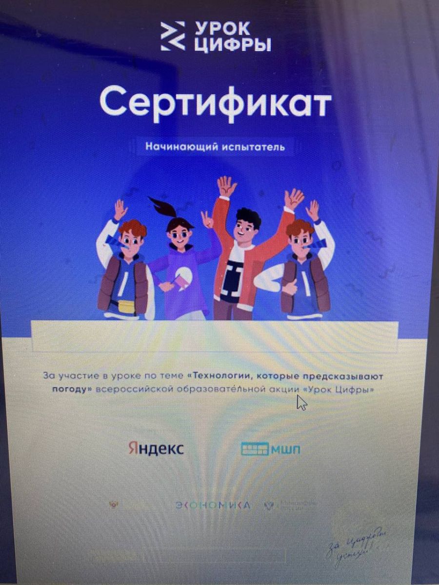 В 1 классе прошел -Урок Цифры по теме « Технологии, которые предсказывают погоду». На уроке ребята просмотрели видеолекцию, где узнали из чего состоит процесс создания прогноза погоды, работали с тренажером по прогнозу погоды и получили сертификаты