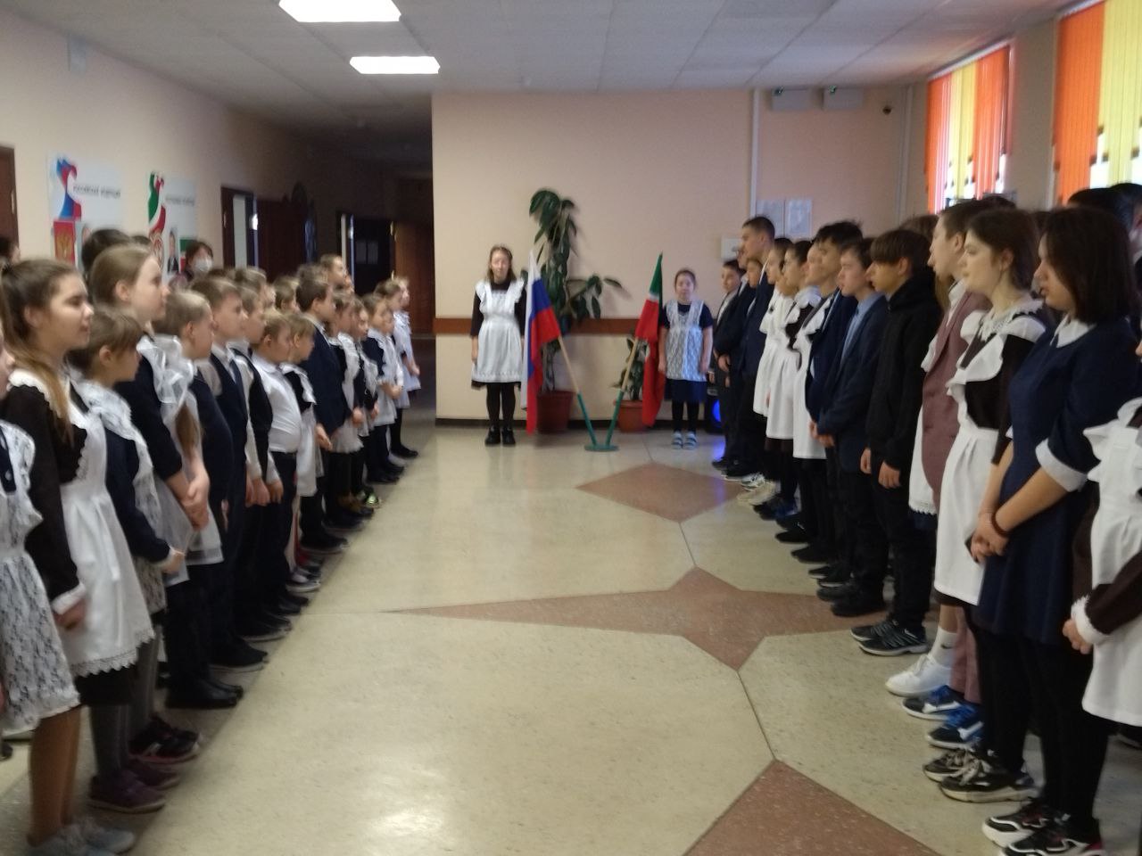Новая учебная неделя в школе началась с выноса флагов и исполнения гимнов. Почетное право выноса флага Российской Федерации и флага Республики Татарстан на этой неделе было предоставлено ученице 8 класса Рвачевой Каролине, призеру республиканской олимпиады школьников по английскому языку "Путь к Олимпу" и ученице 3 класса Биктагировой Сюмбель, победителю республиканской олимпиады "Учу татарский"