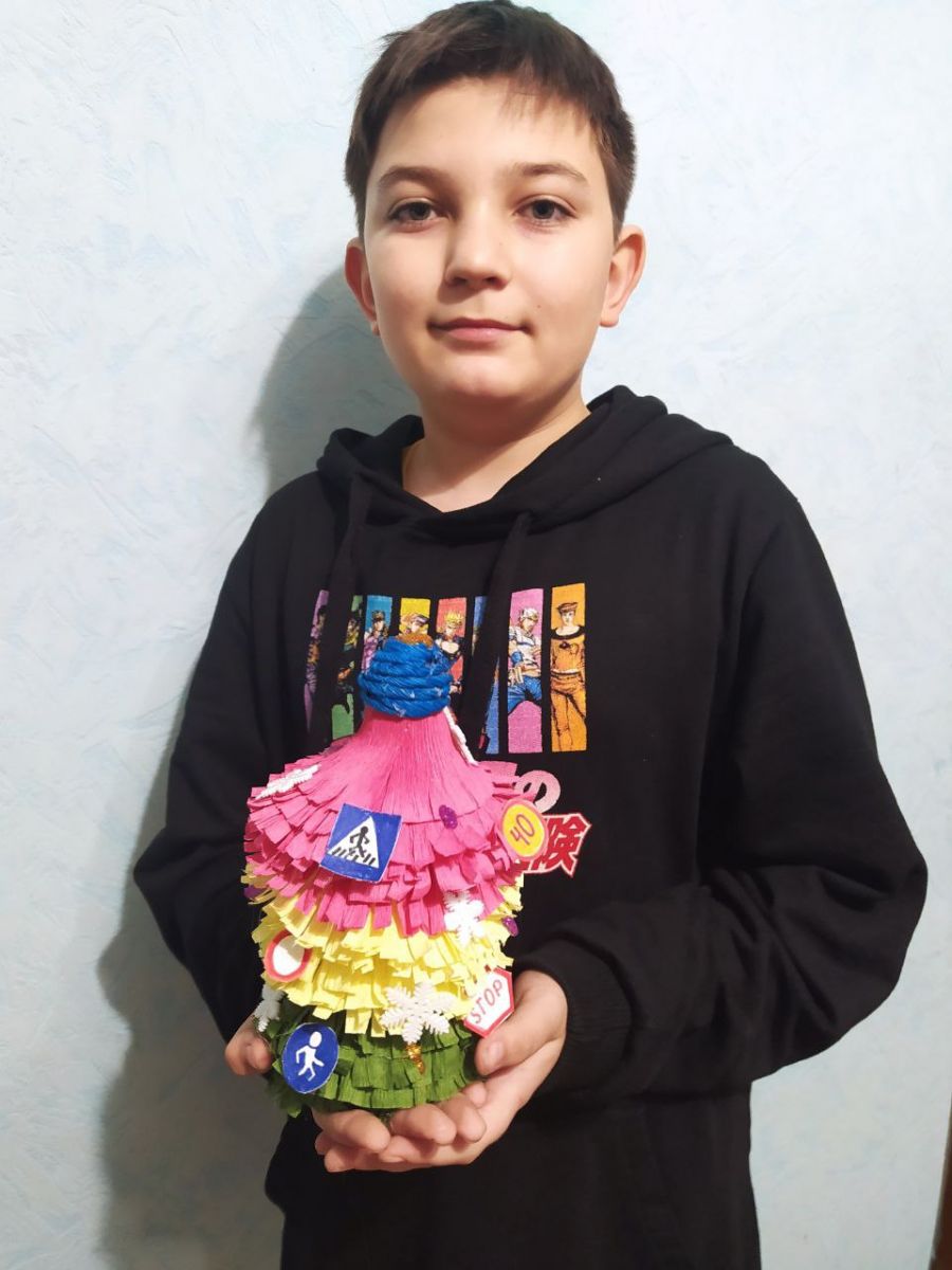 Миннигалеев Рамиль, ученик 7 класса, принимает участие в конкурсе "Безопасность дорожного движения" в номинации "Новогодний подарок" (Елочка-светофор)