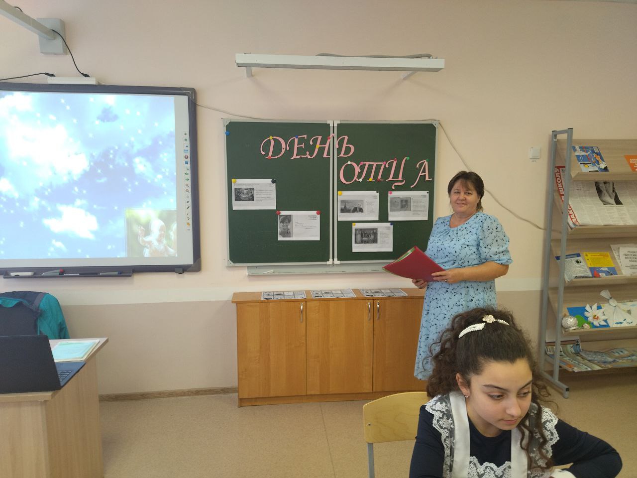 Очередной разговор о важном, проведённый сегодня для 8-9 классов был посвящён Дню отца. Тема мероприятия - «Отчество- от слово «отец». В процессе беседы поговорили о роли отца: он защитник, он мудрый советчик, наставник, друг, добытчик.Ребята с удовольствием играли в игру «Поле чудес».И закончили словами поэтессы Р. А. ДышаленковойОтецЕсть слово- образ, слово- образец,И это слово чистое: «Отец».Есть слово- храм, возвышенный венец,И это слово вечное: «Отец».Есть слово-дом и крыша, и боец,И это слово прочное: «Отец».Есть слово- сердце, нежность, наконец,Есть слово- слёзы, это мой Отец…