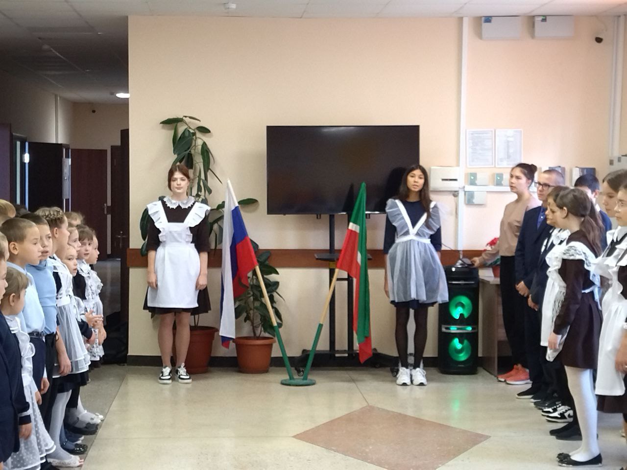 Почетное право выноса Флага Российской Федерации и Флага Республики Татарстан на этой неделе было предоставлено ученицам 9 класса - Яшагиной Н., призеру республиканского этапа конкурса сочинений о своей культуре, и Мухаммадуллиной К., призеру зонального этапа соревнований по бадминтону. Желаем им дальнейших побед.