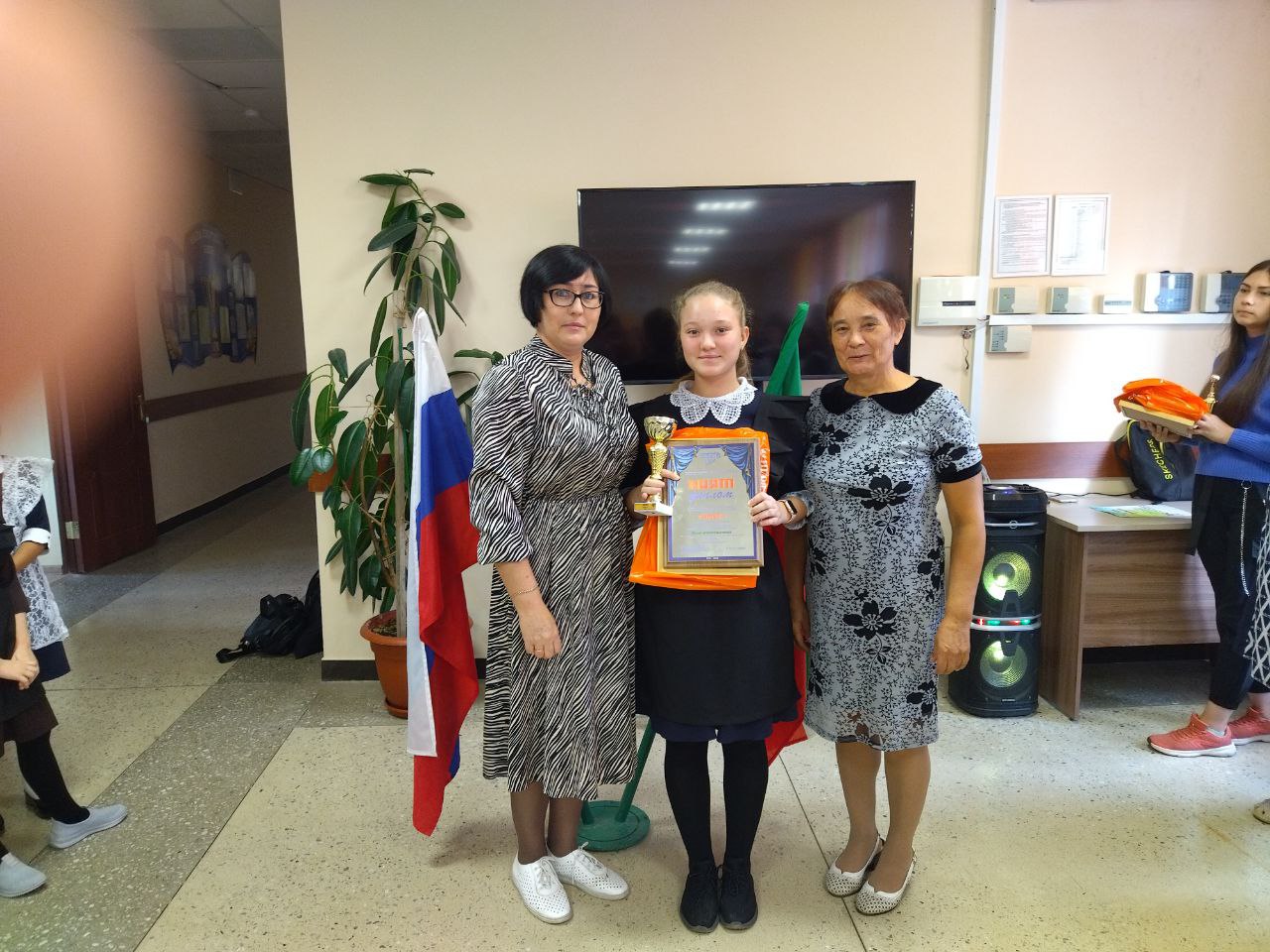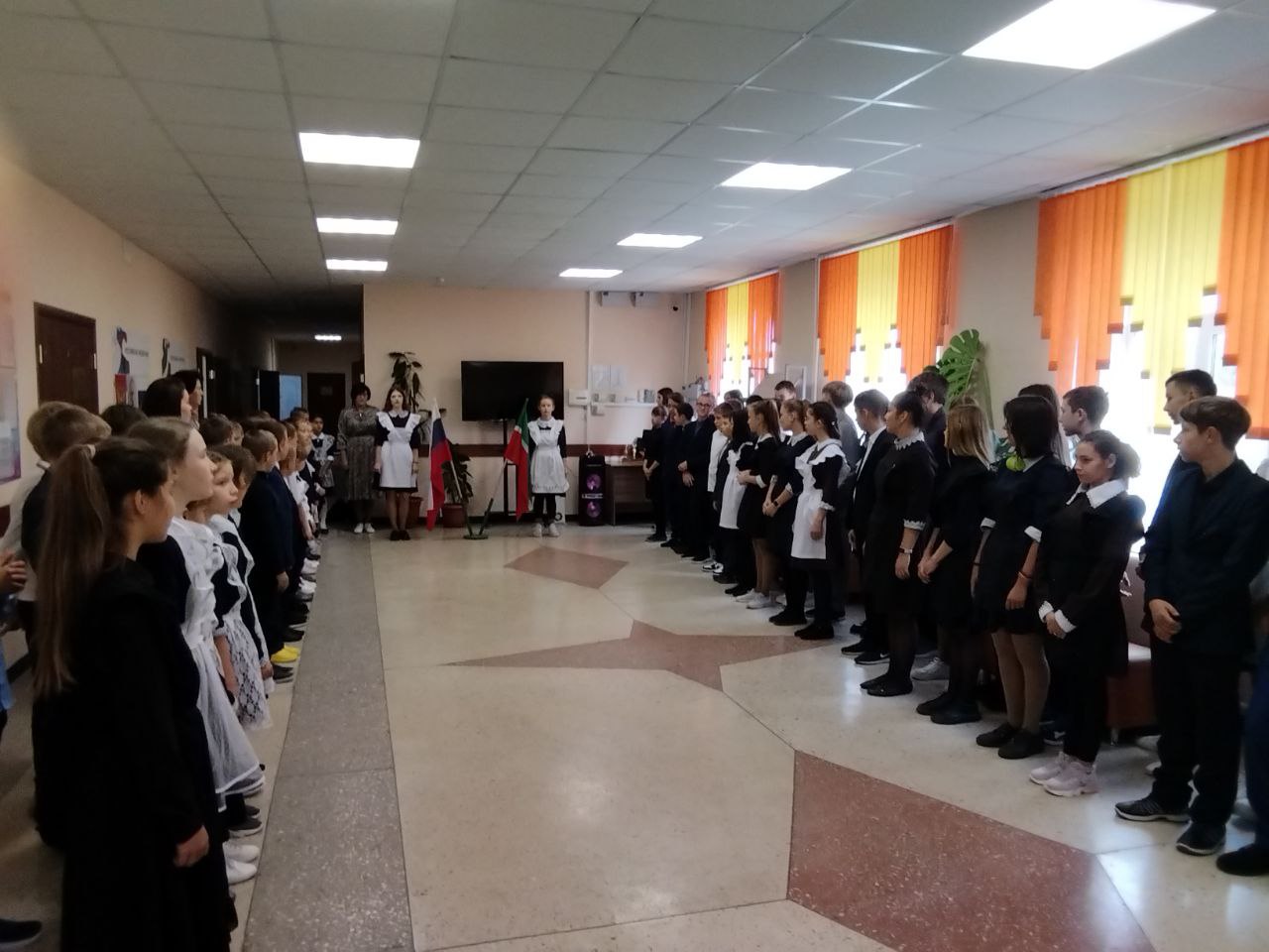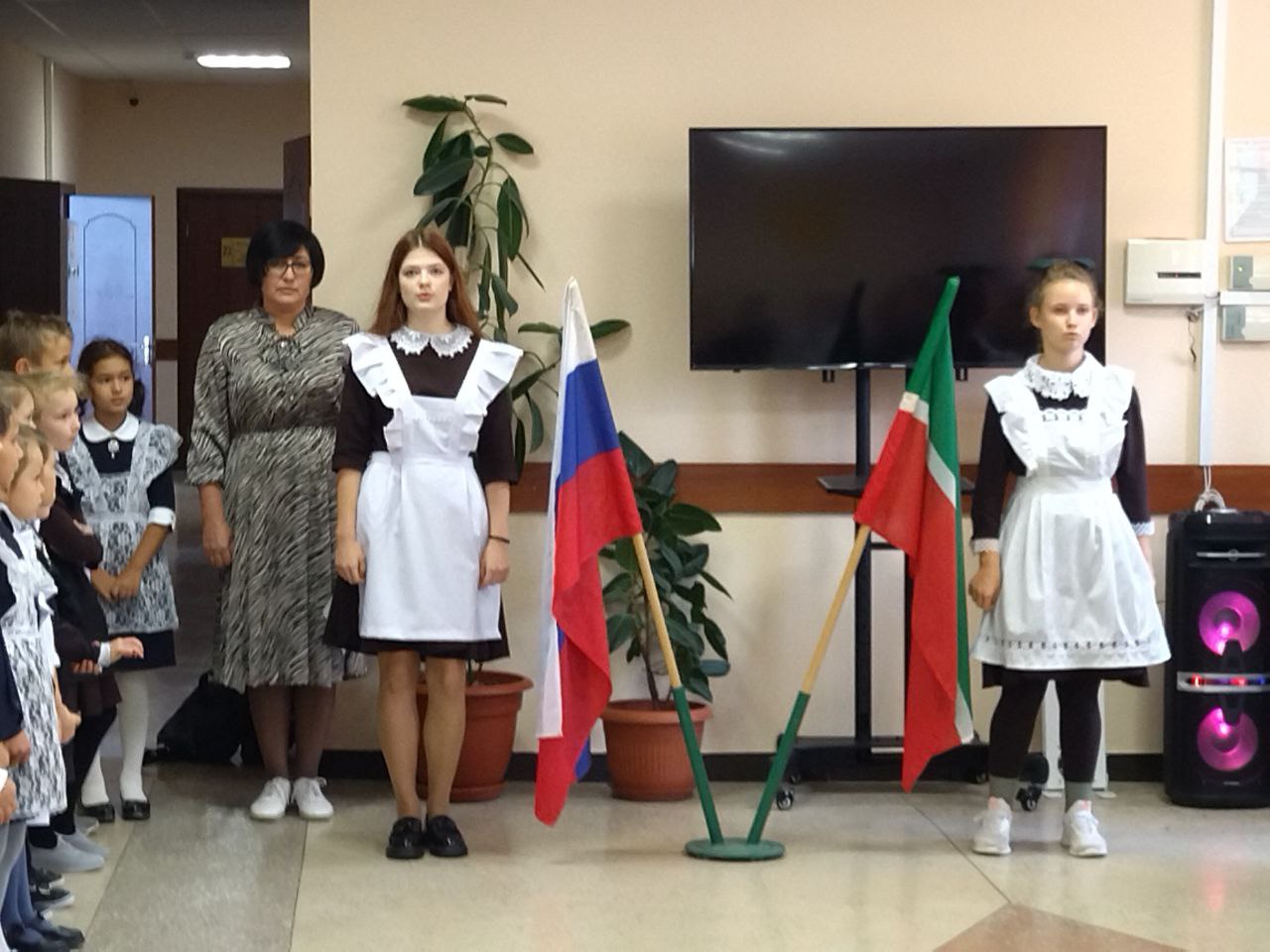 Новая учебная неделя началась с торжественной церемонии выноса Государственного флага России и Флага Республики Татарстан. На этой недели право вынести Государственный флаг России и Государственный флаг Республики Татарстан предоставилипобедителям муниципального этапа Всероссийского конкурса на лучшее сочинение о своей культуре Яшагиной Н. (9 кл) и Рвачевой К. (8 кл)Яңа уку атнасы Россия Дәүләт флагын һәм Татарстан Республикасы флагын чыгару тантанасыннан башланды. Бу атнада Россия Дәүләт флагын һәм Татарстан Республикасы Дәүләт флагын чыгару хокукыЯшагина Н. (9 кл) һәм Рвачева К.. (8 кл)бирелде